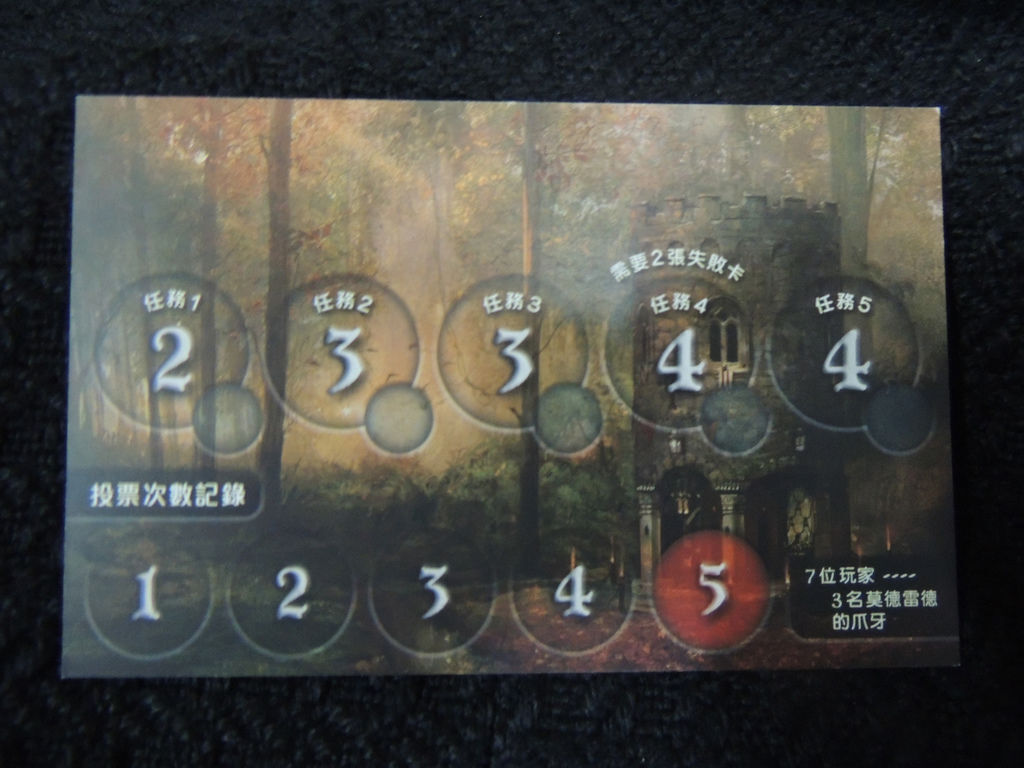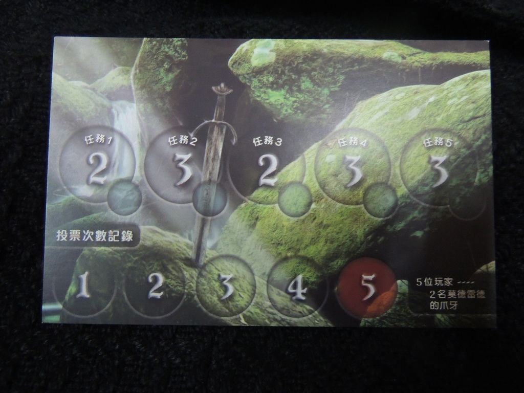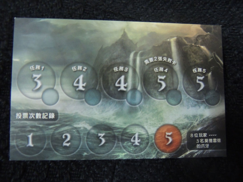 下面這幾張圖是遊戲的底板,依照玩家數量各自有不同的板子。上面會附註這樣的人數要有幾名反派。只要5次都沒能成功出任務(投票平手)的話,壞人就贏了,另外3次任務失敗,壞人也是贏,只有拿到3次任務成功,好人才會獲勝。